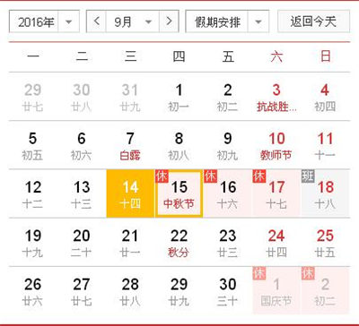 根據(jù)《國務院辦公廳關于2016年部分節(jié)假日安排的通知》和省政府辦公廳有關通知精神,2016年中秋節(jié)放假日期新鄉(xiāng)市天豐振動機械有限公司具體安排如下:9月15日至17日放假調休,共3天。9月18日(星期日)上班。