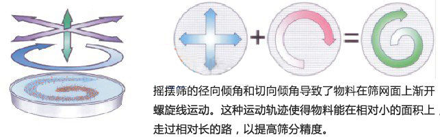 物料在圓形搖擺篩篩面上從中心到外圍擴(kuò)散,物料均勻在篩面上做跳躍旋轉(zhuǎn)的螺旋運(yùn)動,無法篩分到下層的物料會在該層面的出料口排出,直至所有物料篩分完畢。工作任務(wù)結(jié)束。